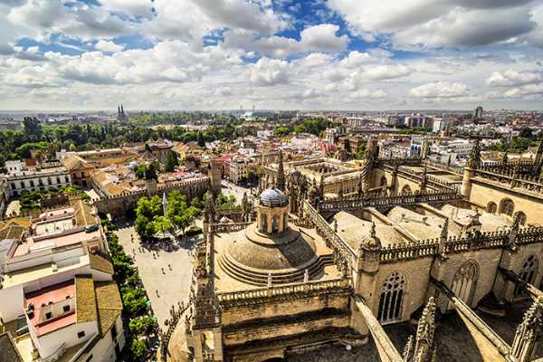 pela catedral de Sevilha e o campanário La Giralda, listados como Patrimônio